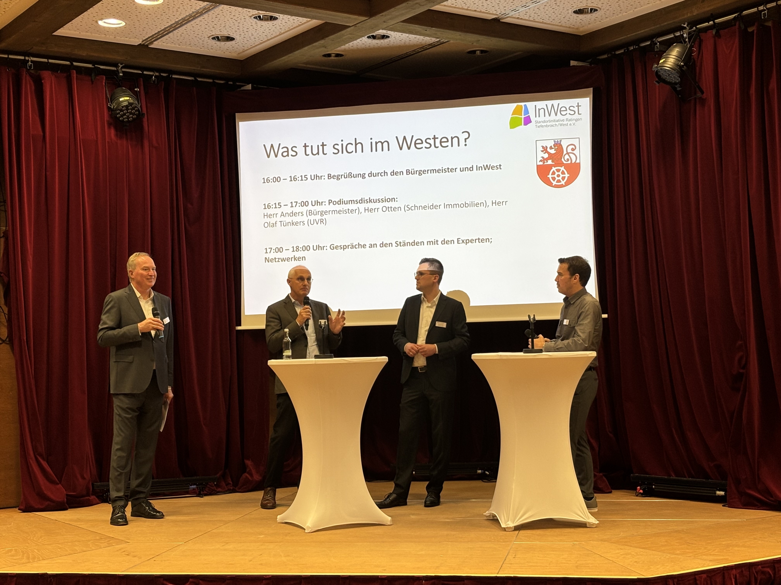 Die Begrüßung erfolgte durch Bürgermeister Patrick Anders, der sich anschließend gemeinsam mit dem Vorstandsvorsitzenden des Unternehmensverbands Ratingen, Olaf Tünkers, und dem Geschäftsführer der Schneider Immobilien GmbH, Tobias Otten, einer Podiumsdiskussion stellte. Die Moderation übernahm der Vorsitzende der Standortinitiative InWest, Thomas Frühbuss.